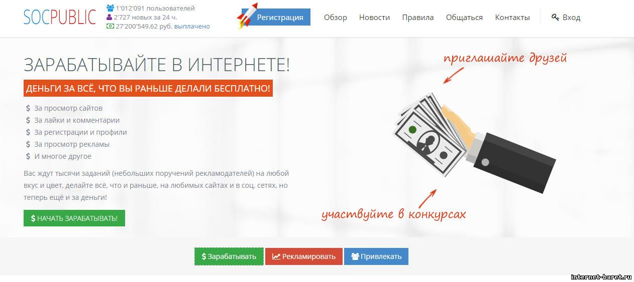 Всем привет, друзья!Я набираю людей в свою команду на проекте socpublic. Это проект для заработка денег и рекламировать свои проекты, сайты. За что платят деньги? А вот за что :) 1. Просмотр сайтов 2. Выполнение заданий 3. Привлечения рефералов 4. Выполнение тестов Присоединяйтесь рефбек 60% Всем удачи;)