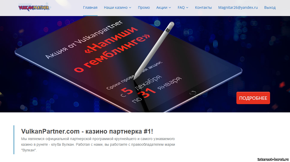 VulkanPartner - это партнерский ресурс для привлечения пользователей в самый узнаваемый бренд онлайн-казино - Вулкан. Высокие партнерские выплаты, простой интерфейс. Выплаты в долларах.