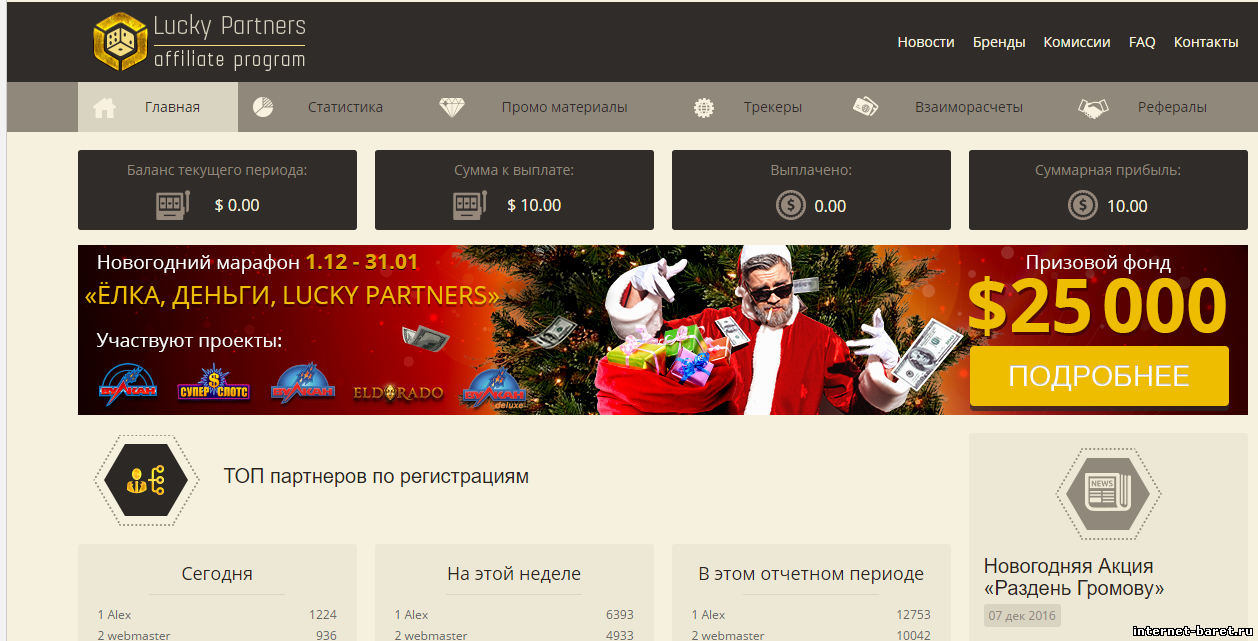 Lucky Partners - это прекрасная партнерская программа, которая работает с 13 онлайн-казино, что будут платить Вам 25-45% от своего дохода. Бонус при регистрации 10 долларов. Возможность привлекать клиентов через ссылки, что дает возможность привлекать клиентов даже не имея своего сайта, или блога, через серфинг, или спам.